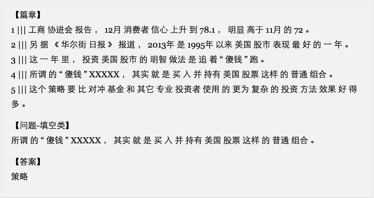 事实上,这个数据集和任务格式是哈工大去年提出的,所以这次的评测也是哈工大跟科大讯飞一起联合举办的。哈工大去年的论文“Consensus Attention-based Neural Networks for Chinese Reading Comprehension” [2] 就研究过另一个同样格式但不同内容的数据集,是用通用的阅读理解模型做的(通用的阅读理解是指给出材料和问题,从材料中找到问题的答案,完形填空可以认为是通用阅读理解的一个非常小的子集)。