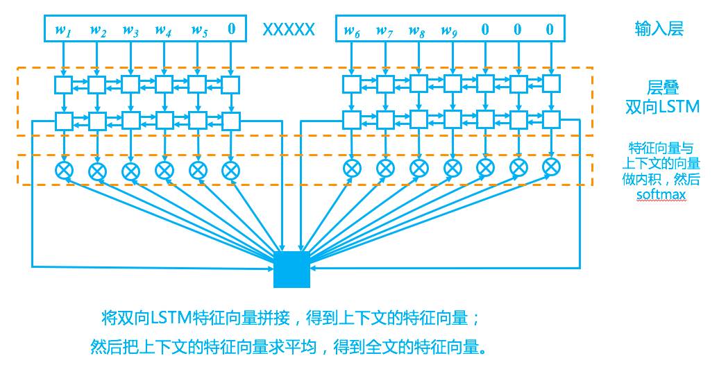 首先,我们以“XXXXX”断开材料,分为上文和下文,然后上文和下文依次输入到同一个双向 LSTM 中(算两次,而不是拼在一起分别算),得到各自的特征。也就是说,上下文的 LSTM 是共享参数的。