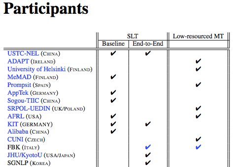除了科大讯飞,IWSLT 2018吸引了世界各地多所机器翻译领域的知名大学及研究所参加,包括英国爱丁堡大学(University of Edinburgh)、美国约翰霍普金斯大学(JHU)、德国卡尔斯鲁厄理工学院(KIT)、意大利Bruno Kessler 基金会(FBK)、芬兰赫尔辛基大学(Helsinki),以及国内的阿里巴巴、搜狗等。