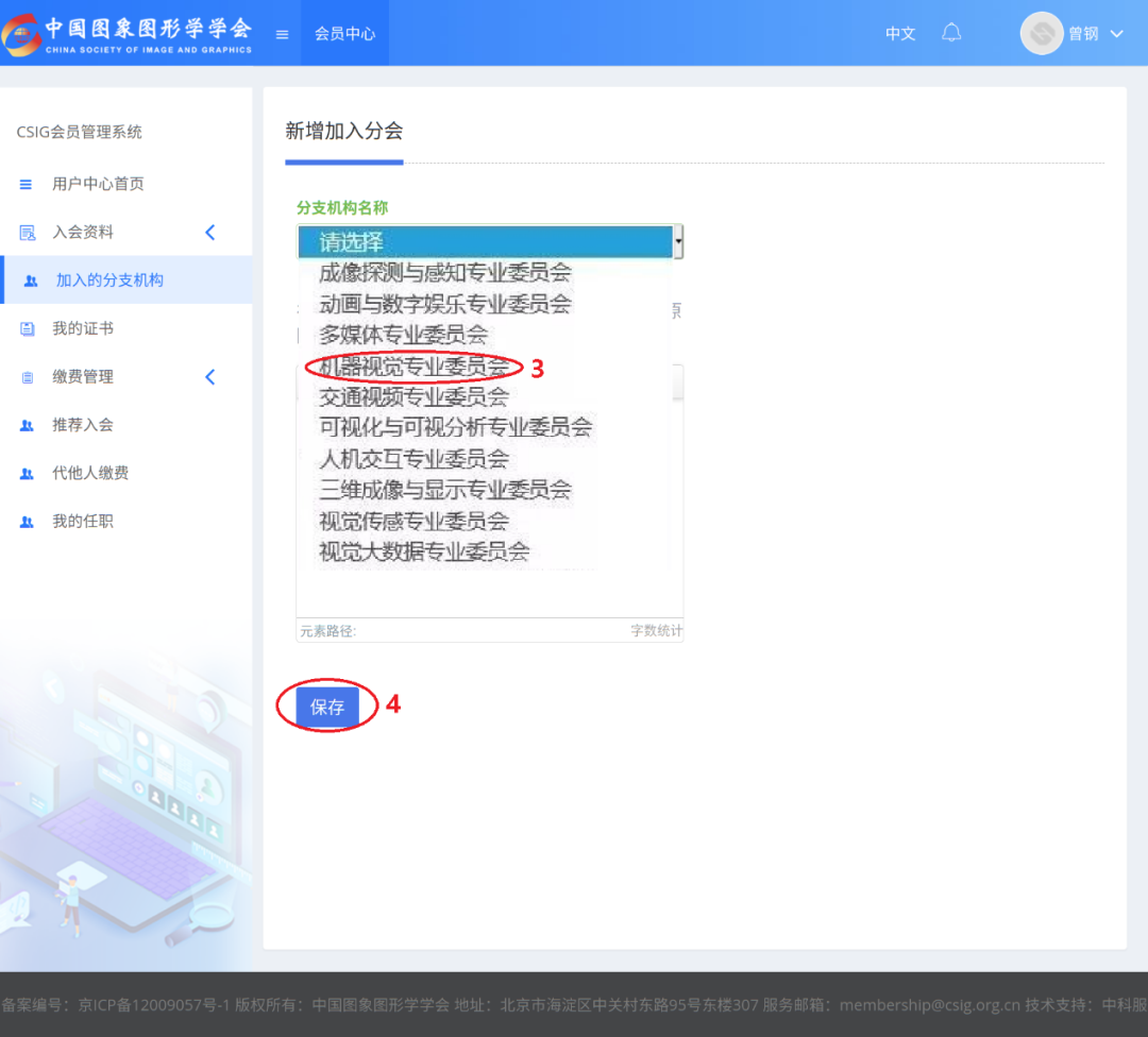 1、在学会系统中选择加入机器视觉专委会: