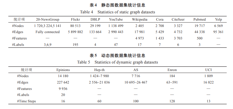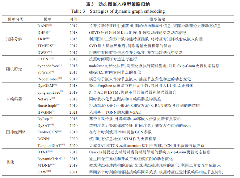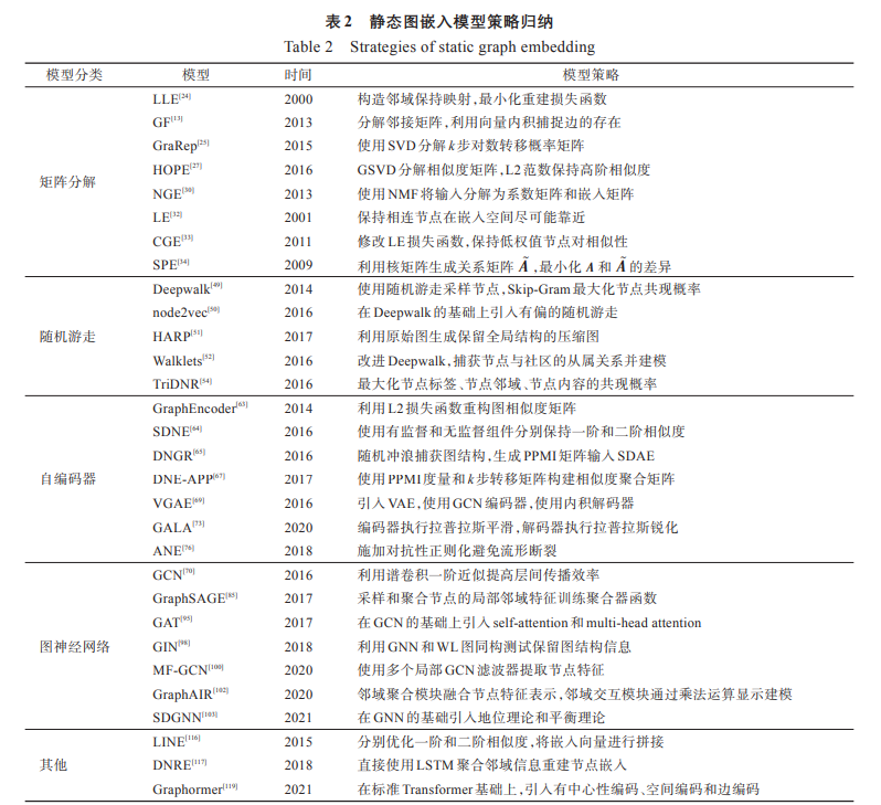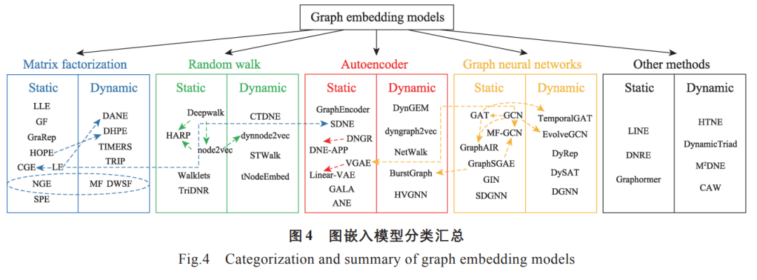 图分析用于深入挖掘图数据的内在特征,然而图作为非欧几里德数据,传统的数据分析方法普遍存在较高的计算量和空间开销。图嵌入是一种解决图分析问题的有效方法,其将原始图数据转换到低维空间并保留关键信息,从而提升节点分类、链接预测、节点聚类等下游任务的性能。与以往的研究不同,同时对静态图和动态图嵌入文献进行全面回顾,我们提出一种静态图嵌入和动态图嵌入通用分类方法, 即基于矩阵分解的图嵌入、基于随机游走的图嵌入、基于自编码器的图嵌入、基于图神经网络(GNN)的图嵌入和基于其他方法的图嵌入。其次,对静态图和动态图方法的理论相关性进行分析,对模型核心策略、下游任务和数据集进行全面总结。最后,提出了四个图嵌入的潜在研究方向。