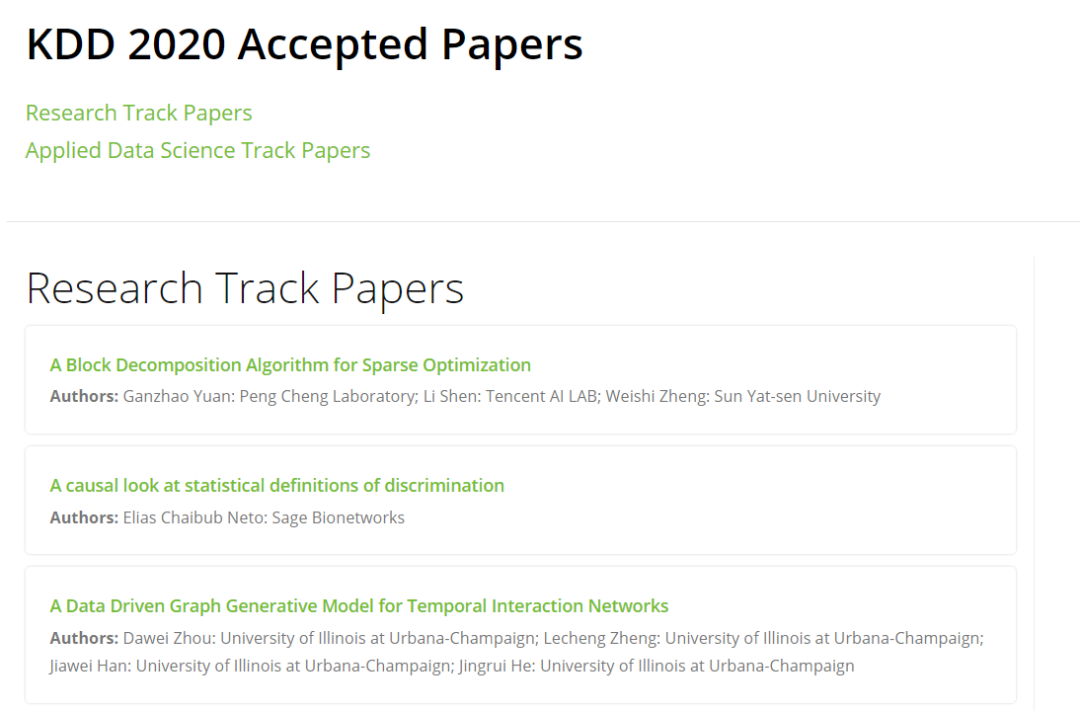 KDD2020官方今日发布接收论文,共有1279篇论文提交到Research Track,共有216篇接受,接受率16.8%。