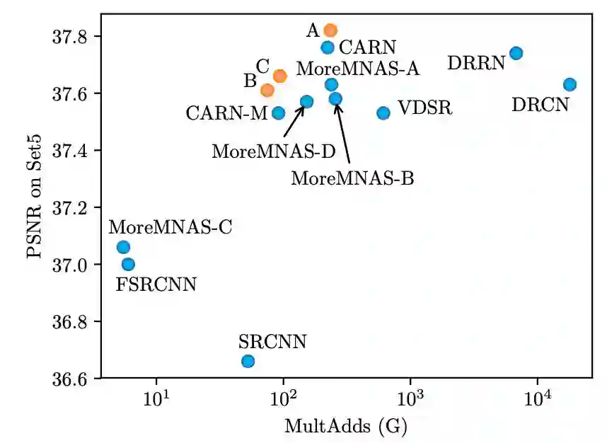 目前已有的超分辨率模型大多数都是人工设计的,它们很难进行压缩或者微调。与此同时,神经架构搜索已经在分类任务中取得了极好的效果。根据这一趋势,Chu et al., 2019 提出了使用强化遗传搜索方法处理 SISR 任务,该方法优于 VDSR [Kim et al., 2016a] 等流行网络。