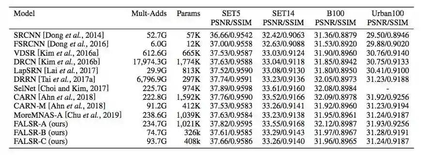 在 FLOPS 相当的模型对比中,本研究提出的 FALSR-A 模型优于 CARN [Ahn et al., 2018](图 3)。此外,FALSR-A 模型还在四个数据集和三个目标上超过 DRCN [Kim et al., 2016b] 和 MoreMNAS-A [Chu et al., 2019]。它的 PSNR 和 SSIM 值高于 VDSR [Kim et al., 2016a]、DRRN [Tai et al., 2017a] 等,且 FLOPS 低于后者。