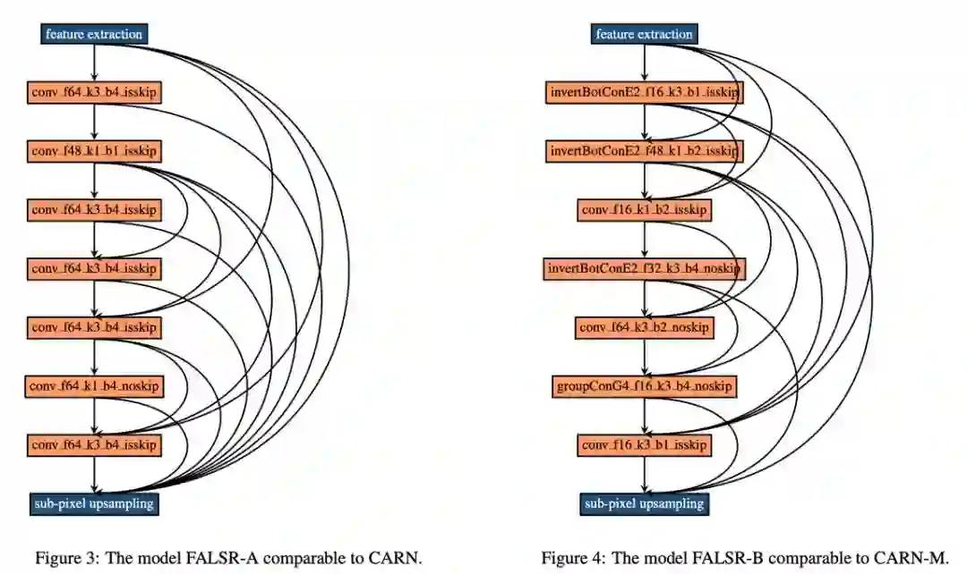 研究者还创建了一个更轻量级的版本——FALSR-B(图 4),它超越了 CARN-M,这意味着更少 FLOPS 与参数量的情况下,FALSR-B 的得分堪比甚至超越 CARN-M。此外,它的架构更吸引人,连接之间的复杂度介于稀疏和密集连接(dense connection)之间。这表示密集连接不总是信息传输的最优方法。来自更低层的无用特征可能会给高网络层重建超分辨率结果造成麻烦。