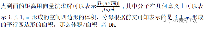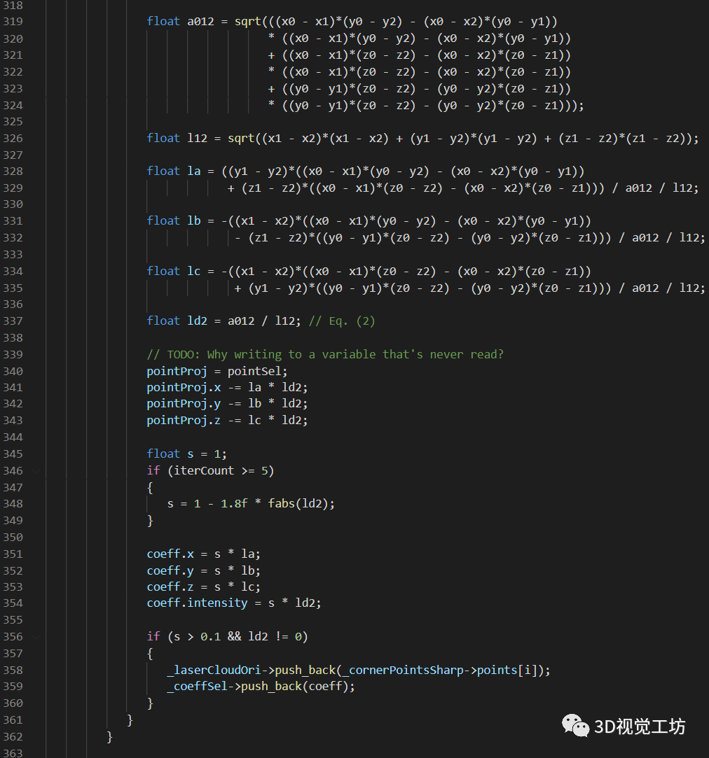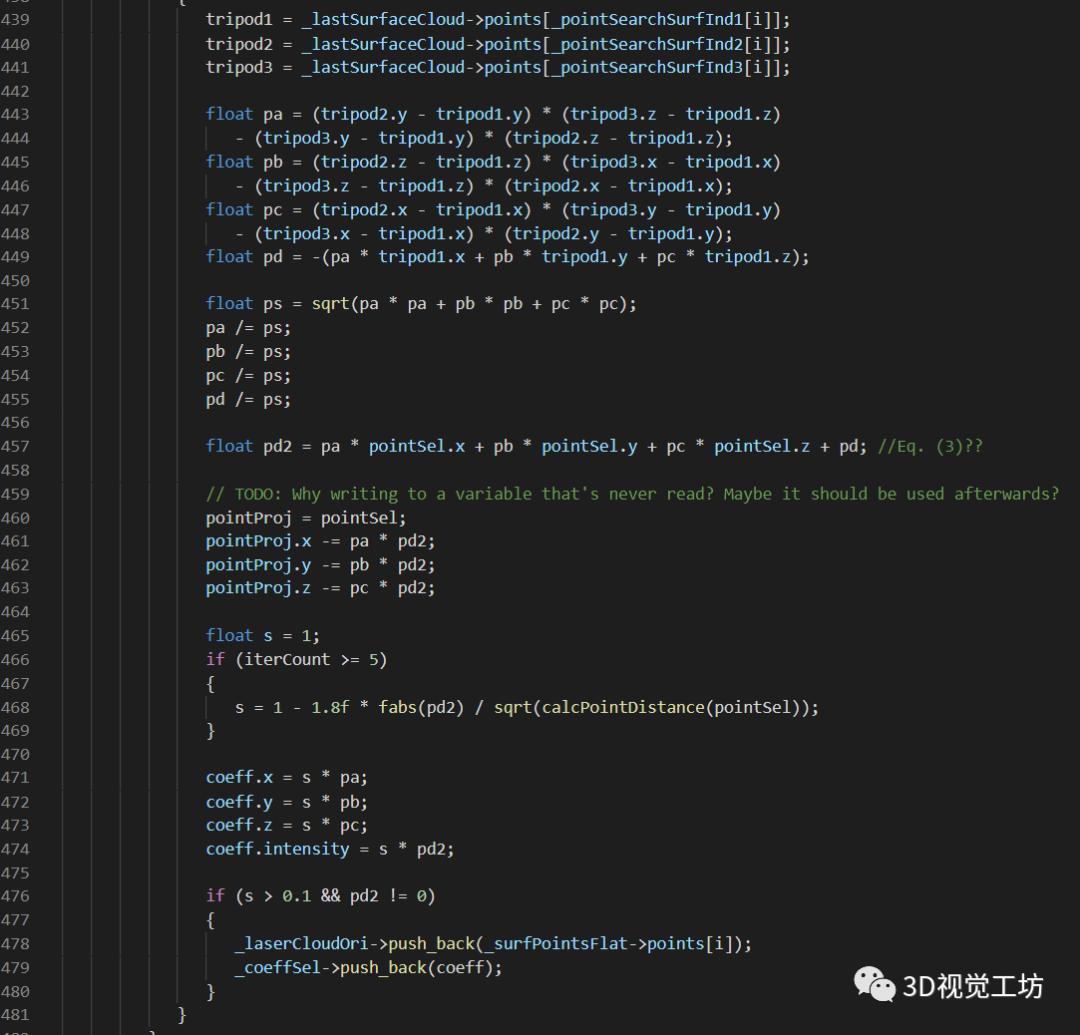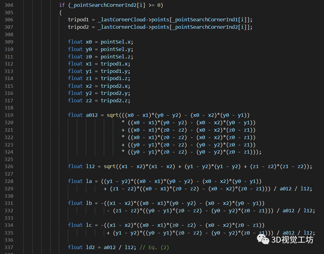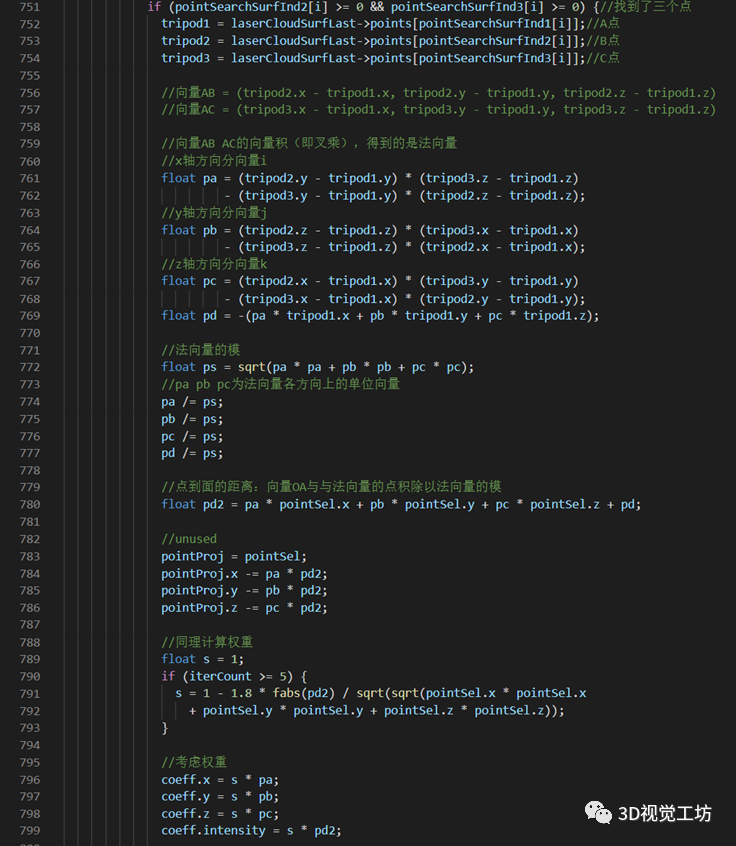 按照算法流程,需要根据提取的特征点,来建立点到线和点到面的约束关系即点到线的距离 和 点到面的距离最小。代码中求取两个距离的原理公式如下: