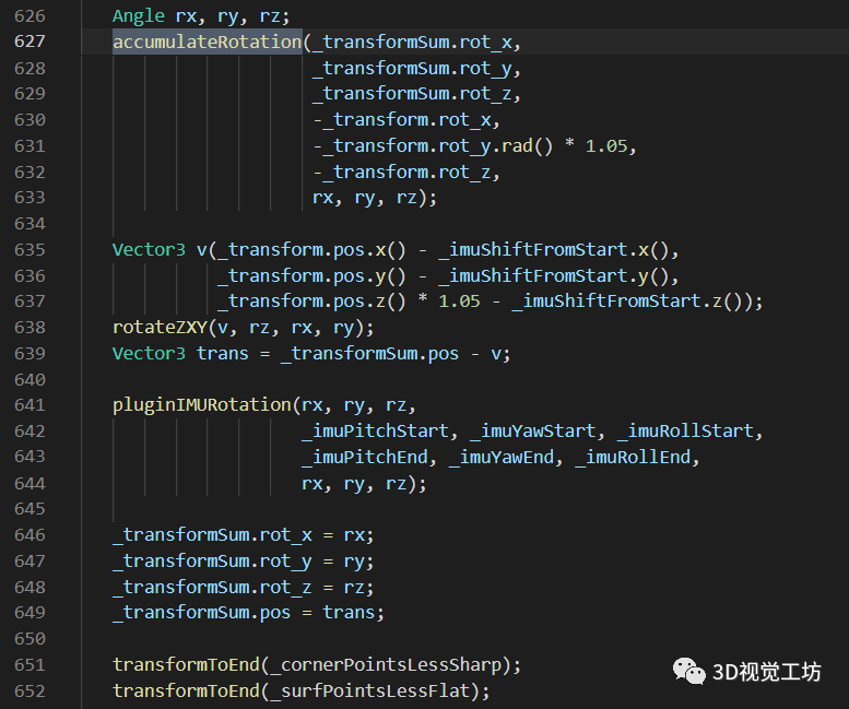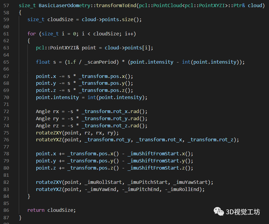 transformToEnd 函数中就是先做了transformToStart ,再将点云全部都转换到一帧的结束时刻。