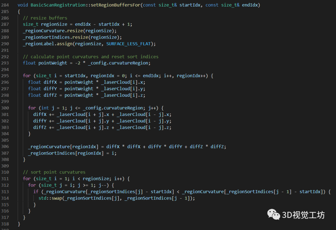 该部分代码通过求取diffX * diffX + diffY * diffY + diffZ * diffZ 来近似表示曲率,通过曲率的大小来划分是角点和平面点。其中 _config.curvatureRegion 设为5,表示取该点左右各5个点作为邻域范围来求取曲率。因此pointWeight = -2 * _config.curvatureRegion = -10,带入循环公式中变为:
