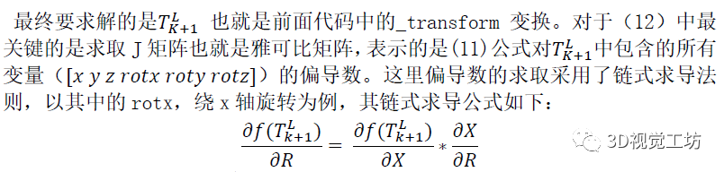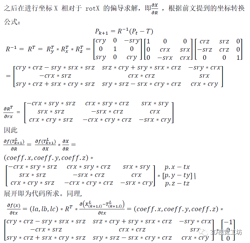 那么根据链式法则,我们就可以先通过约束方程对坐标进行求偏导,然后再乘以坐标对变换中的rotX求偏导,即可得到最终的偏导求取结果。