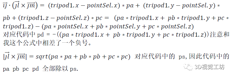 结合代码带入上述公式,i 点坐标为代码中的 (pointSel.x, pointSel.y, pointSel.z);j 点坐标为代码中的(tripod1.x, tripod1.y, tripod1.z);l点坐标为代码中的(tripod2.x, tripod2.y, tripod2.z);m 点坐标为代码中的(tripod3.x, tripod3.y, tripod3.z)。