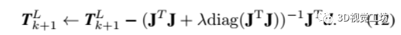 LOAM中利用建立点到线 和点到面的距离最小值来作为约束方程,最后利用L-M非线性优化方法来求解这个非线性问题。对于L-M方法,用到的公式如下:
