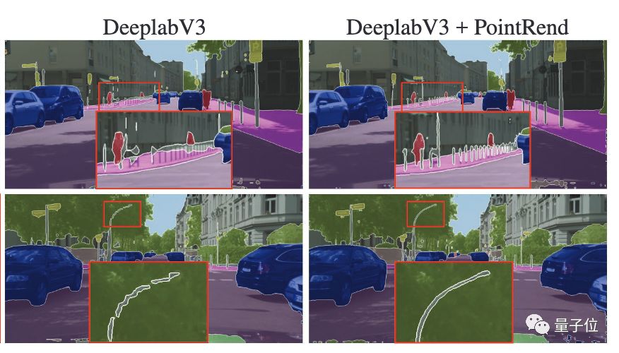 在语义分割方面,他们的研究结果表明,使用PointRend能够进一步提升DeeplabV3和 SemanticFPN的效果。在实验对比中,采用的是Cityscapes语义分割集。