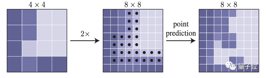 然后再次密度较高的网格上选择N个最不确定的点(如上图黑点),举个例子,对于二进制mask而言,就是概率最接近0.5的那些点。
