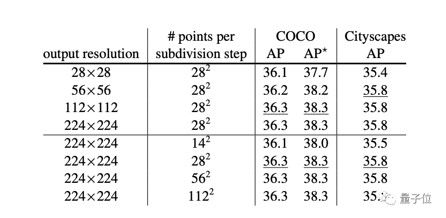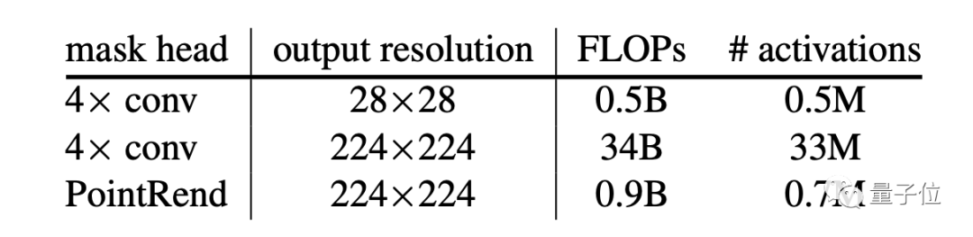 在输出224x224分辨率图像下,PointRend只需0.9B FLOPs,而4×conv需要34B,相比之下优化了30多倍。