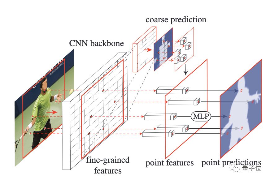 PointRend通过组合低层特征 (fine-grained features) 和高层特征 (coarse prediction),在选定的点上构造逐点特征。