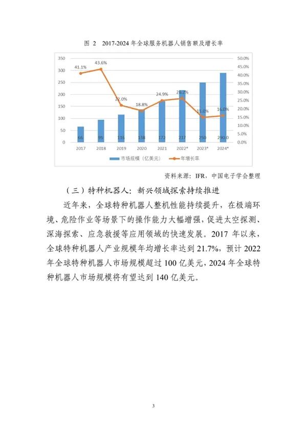 新一代信息技术、生物技术、新能源技术、新材料技术等与机器人技术加快融合。《报告》显示,机器人在汽车制造、电子制造、仓储运输、医疗康复、应急救援等领域的应用不断深入拓展。预计2022年,全球机器人市场规模将达到513亿美元,2017至2022年的年均增长率达到14%。其中,工业机器人市场规模将达到195亿美元,服务机器人达到217亿美元,特种机器人超过100亿美元。预计到2024年,全球机器人市场规模将有望突破650亿美元。