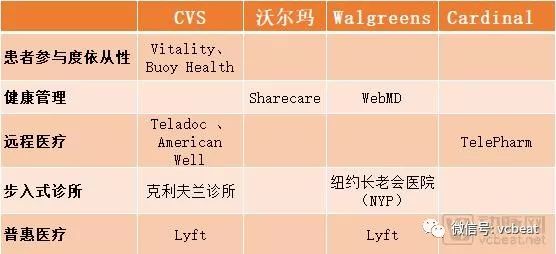 CVS的转型很早就开始,其着重在远程医疗、提升药物依从性、用户健康管理上和数字化健康科技公司合作,打造一个集零售药店和药店服务为一体的健康服务公司。