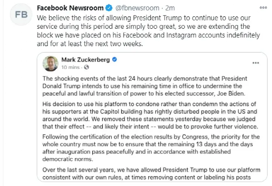 随后,Facebook和Instagram也封了川普的账号,扎克伯格发帖表示「让总统继续使用我们的服务,风险实在太大了」。