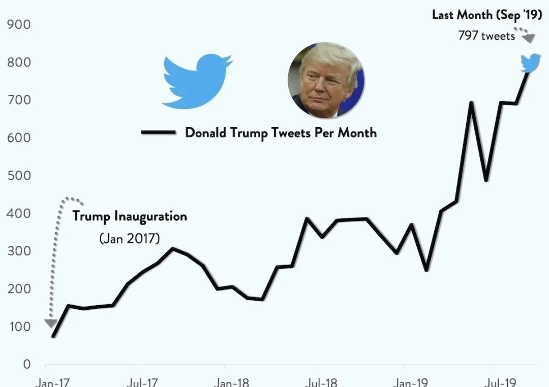 他的推文的风格包括大写字母,感叹号和拼写错误。多年以来,他一直通过这些平台,向「1亿多」的粉丝宣传自己的思想,或好或坏的。他在这些社交媒体上的影响力也远超过其他的公众人物。