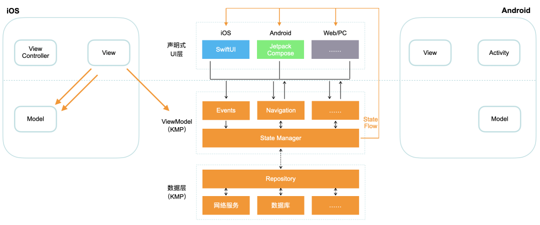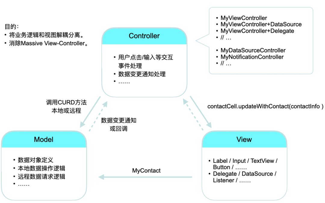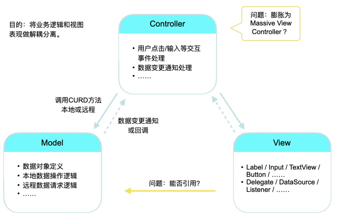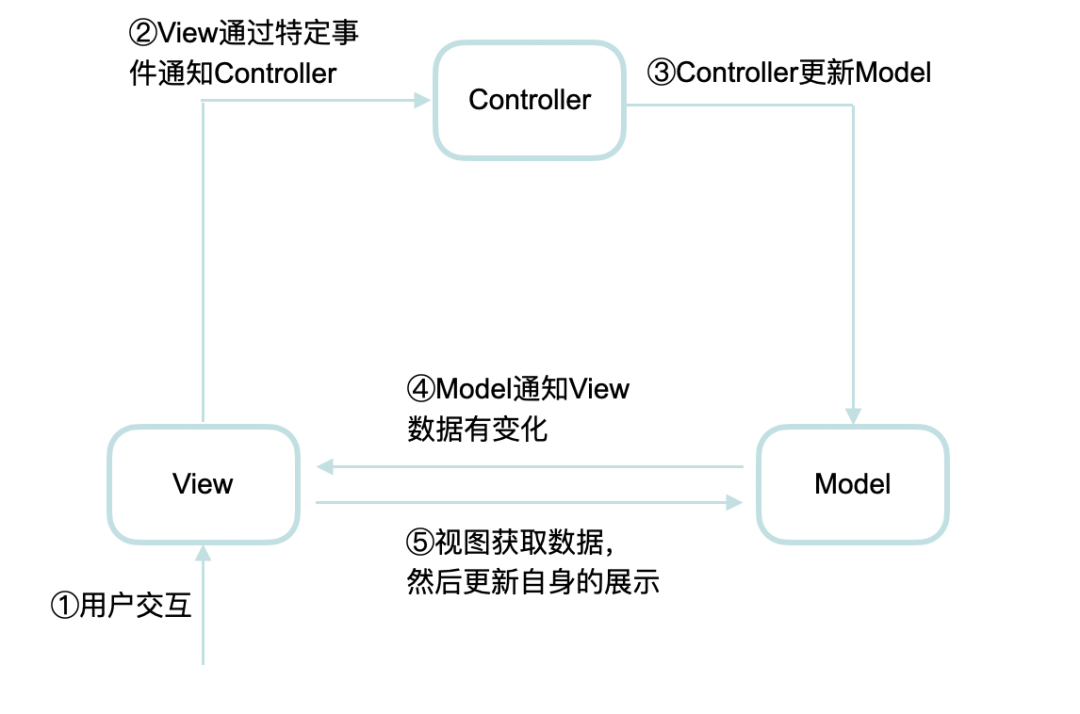 我之所以没有在上图中对M-V-C添加箭头线条,是因为在这一点上,不同程序员也有不同理解和实践。