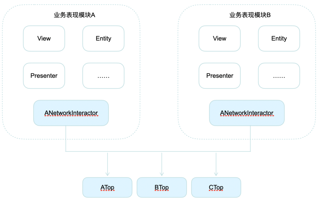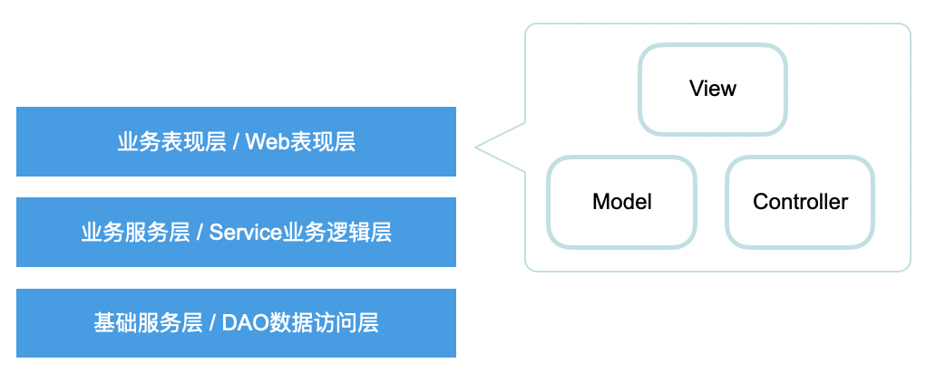 左侧 业务表现层-业务服务层-基础服务层 是移动端三层架构模式,未涉及到 C/S 交互;右侧是Web B/S场景的三层架构模式。