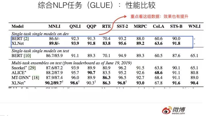 如果让我推论下XLNet的出现,对后续NLP工作的影响,我觉得跟Bert比,最直接的影响应该有两个,一个是对于Bert长文档的应用,因为Transformer天然对长文档任务处理有弱点,所以XLNet对于长文档NLP任务相比Bert应该有直接且比较明显的性能提升作用,它在论文中也证明了这点。所以,以后长文档类型的NLP应用,XLNet明显跟Bert比占优势。当然,你说我把Transformer XL的因素引入Bert,然后继续在Bert上做改进,明显这也是可以的。