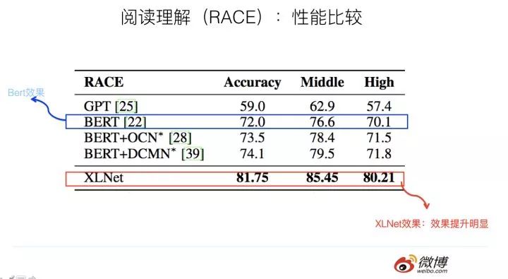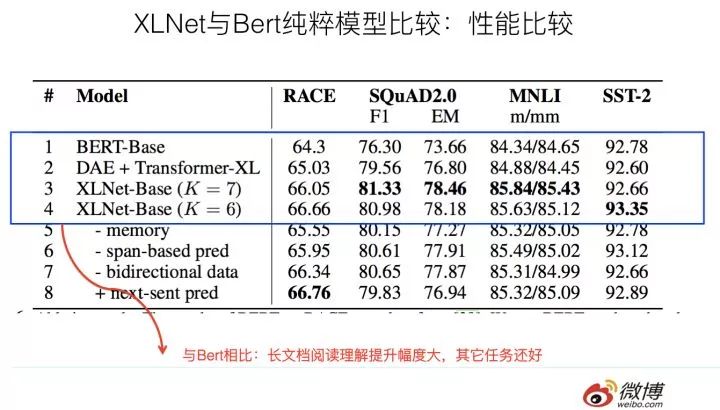 因为和Bert比较,XLNet使用相同的预训练数据。所以两者的性能差异来自于:Permutation Language Model预训练目标以及Transformer XL的长文档因素。
