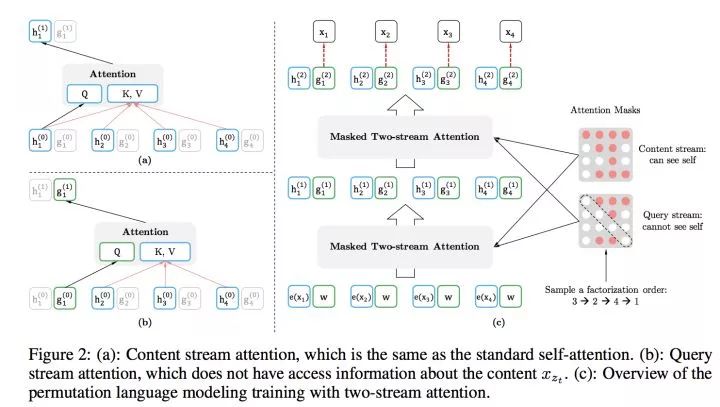 这里简单说下“双流自注意力机制”,一个是内容流自注意力,其实就是标准的Transformer的计算过程;主要是引入了Query流自注意力,这个是干嘛的呢?
