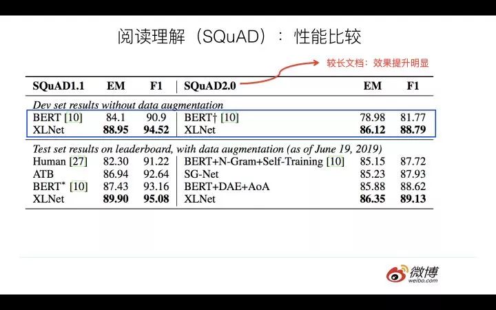 说XLNet在阅读理解,尤其是长文档的阅读理解中,性能大幅超过Bert,这个是没疑问的。但是,因为XLNet融入了上文说的三个因素,所以不确定每个因素在其中起的作用有多大,而对于长文档,Transformer XL的引入肯定起了比较大的作用,Bert天然在这种类型任务中有缺点,其它两类因素的作用不清楚。