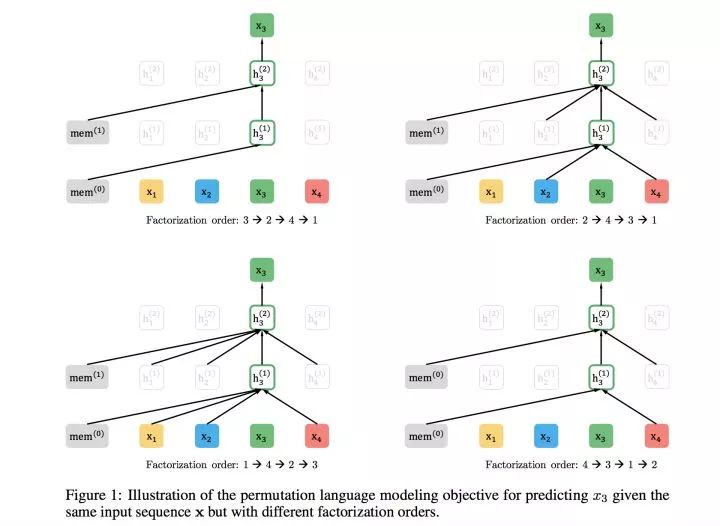 就是说,比如包含单词Ti的当前输入的句子X,由顺序的几个单词构成,比如x1,x2,x3,x4四个单词顺序构成。我们假设,其中,要预测的单词Ti是x3,位置在Position 3,要想让它能够在上文Context_before中,也就是Position 1或者Position 2的位置看到Position 4的单词x4。可以这么做:假设我们固定住x3所在位置,就是它仍然在Position 3,之后随机排列组合句子中的4个单词,在随机排列组合后的各种可能里,再选择一部分作为模型预训练的输入X。比如随机排列组合后,抽取出x4,x2,x3,x1这一个排列组合作为模型的输入X。于是,x3就能同时看到上文x2,以及下文x4的内容了。