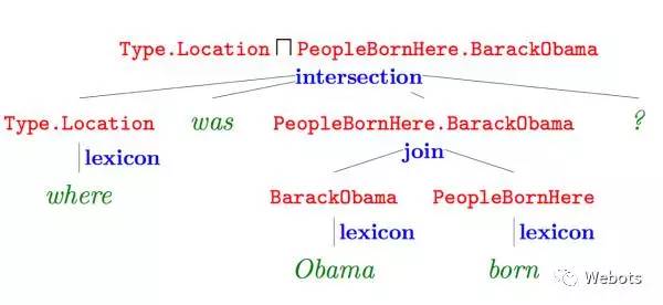 上图红色部分即逻辑形式,绿色部分 where was Obama born 为自然语言问题,蓝色部分为词汇映射(Lexicon)和构建(Composition)使用的操作,最终形成的语义解析树的根节点即语义解析结果。
