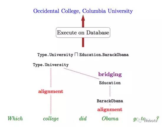 这里举个具体的例子,比如“Which college did Obama go to?” 假设“Obama” 和 “college” 可被词汇映射映射为 BarackObama 和 Type.University,这里"go to" 却难以找到一个映射,事实上,这里我们需要去寻找一个中间二元关系(即Education)使得上面的句子可以被解析为 (Type.University ∩ Education.BarackObama),如下图所示: