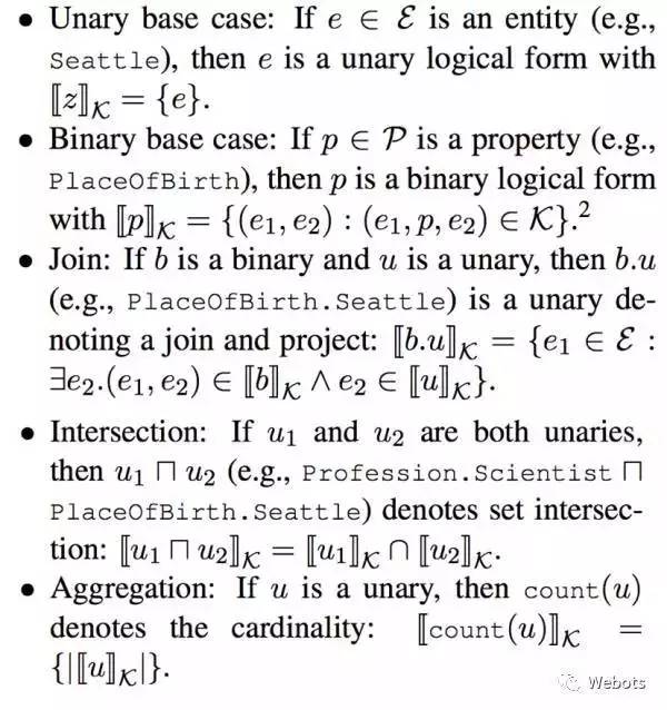 我们用表示一个逻辑形式,用表示知识库,表示实体,表示实体关系(有的也称谓语或属性)。简单而言,逻辑形式分为一元形式(unary)和二元形式(binary)。对于一个一元实体,我们可以查询出对应知识库中的实体,给定一个二元实体关系,可以查到它在知识库中所有与该实体关系相关的三元组中的实体对。并且,我们可以像数据库语言一样,进行连接 Join,求交集 Intersection 和聚合 Aggregate(如计数,求最大值等等)操作。具体来说,逻辑形式有以下形式和操作: