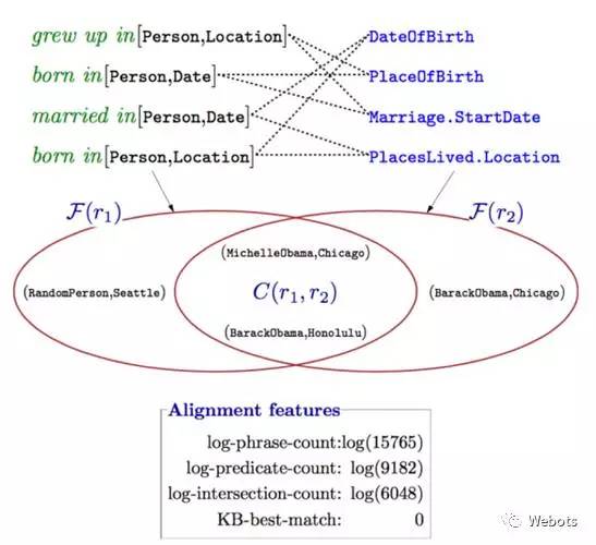 同样的,通过对知识库进行统计,对每一个知识库三元组中的实体关系 r2 也统计其两边的实体,可以得到实体对集合 F(r2),通过比较集合 F(r[t1,t2]) 和集合 F(r2) 类似 Jaccard 距离(集合交集元素数目比集合并集元素个数)这样的特征来确定是否建立词汇映射,如下图所示: