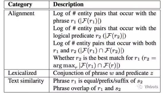 图中绿色字体为 r1,蓝色字体为 r2。作者定义了词汇映射操作的三种特征(用于训练分类器),对齐特征(Alignmentfeatures),文本相似度特征(Textsimilarity features),和词汇化特征(Lexicalizedfeatures),具体内容如下表所示: