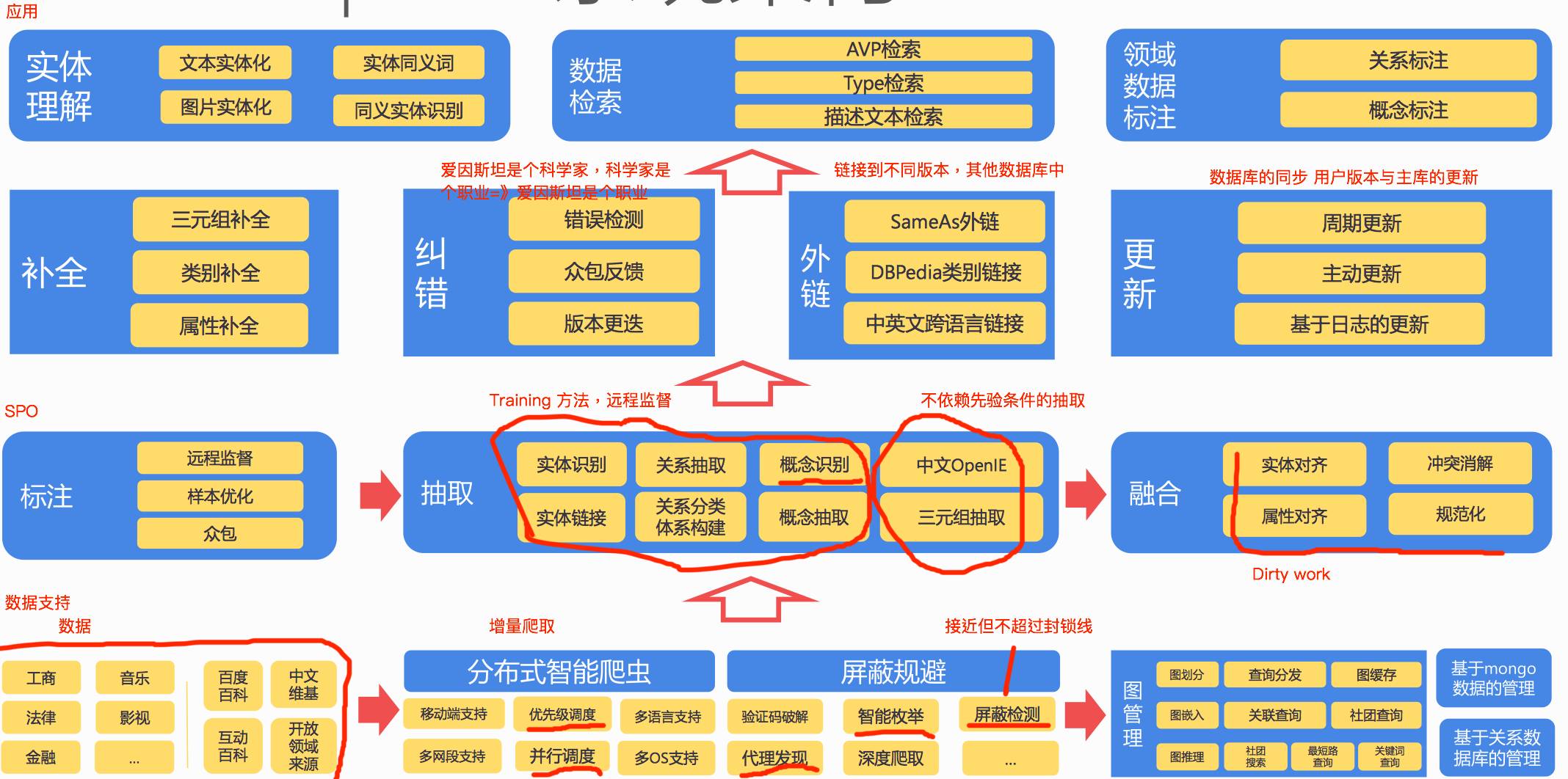 尤其是纯文本数据会涉及到的实体识别、实体链接、实体关系识别、概念抽取 等,需要用到许多自然语言处理的技术,包括但不仅限于分词、词性标注、分布式语义表达、篇章潜在主题分析、同义词构建、语义解析、依存句法、语义角色标注、语义相似度计算等等。