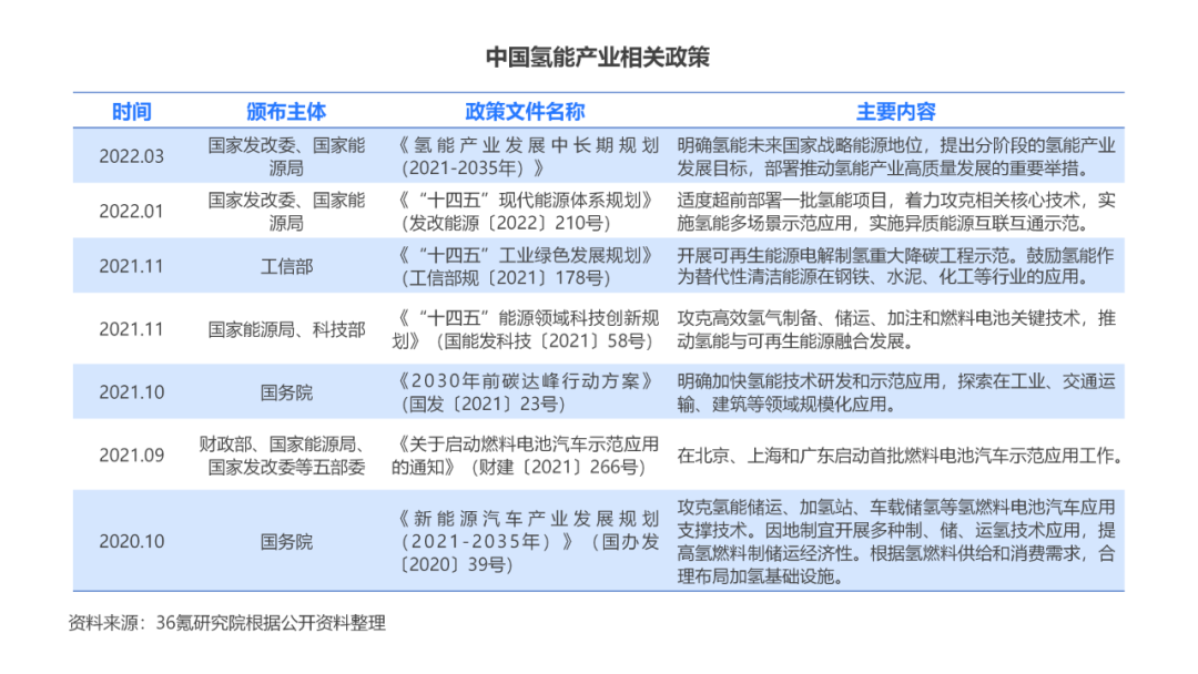 氢能是一种来源丰富、绿色低碳、应用广泛的二次能源,是助力实现碳达峰、碳中和目标,构建清洁低碳、安全高效能源体系的重要载体。近年来,国务院、发改委、能源局等陆续出台行动意见、发展规划等政策文件,促进氢能产业高质量发展。2022年3月23日,国家发改委和国家能源局印发《氢能产业发展中长期规划(2021-2035年)》,明确氢能是未来国家能源体系的组成部分和战略性新兴产业的重点方向,并提出分阶段的氢能产业发展目标,规划至2035年形成氢能产业体系,构建涵盖交通、储能、工业等领域的多元氢能应用生态。