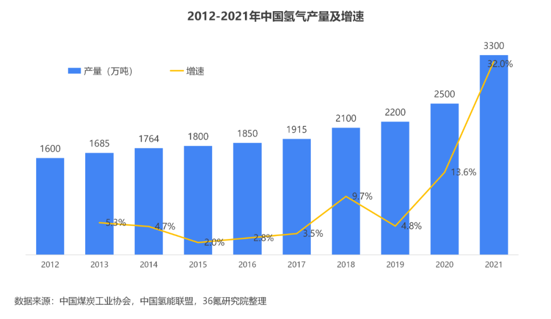 近10年来我国氢气产量保持连续增长,已成为世界第一产氢大国。2020年9月,“双碳”目标的提出带动氢产量快速提升,2021年我国氢能产量达3,300万吨,同比增长32%。与此同时,以燃料电池为代表的下游需求强势增长,带动氢能市场规模快速扩张。根据中国氢能联盟数据,2020年中国氢能行业市场规模为3,000亿元,预计至2025和2035年,氢能行业产值将分别达1万亿和5万亿规模。