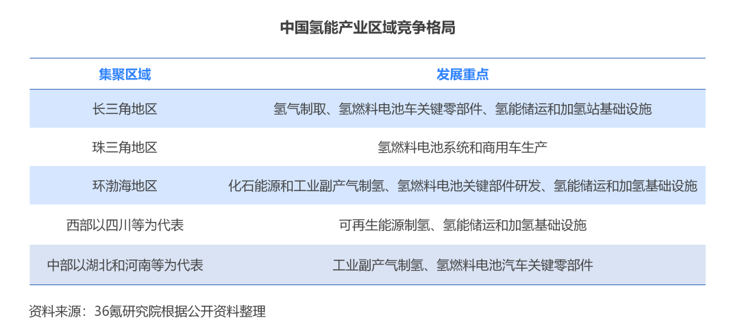 近年来,多省发布氢能及燃料电池产业发展规划,加速氢能产业化进程。从区域竞争格局来看,我国氢能产业形成了长三角地区、珠三角地区、环渤海地区和中西部重点地区集聚发展态势。其中,长三角地区是我国氢燃料研发和示范最早的地区,在氢气制取、氢燃料电池系统关键零部件研发方面稳步推进;珠三角地区在燃料电池商用车生产建立了成熟的产业链,在加氢站建设方面领先全国;环渤海地区具有科研、政策和化工产业优势,较早开展工业副产气制氢、产业链关键零部件研发和燃料汽车大规模应用示范。另外,西部地区以四川为代表,以其油气资源和水电资源优势,成为国内可再生能源制氢和燃料电池电堆研发的重要地区;中部地区以湖北和河南为代表,着力发展氢气制取、氢燃料电池汽车研发和制造、大客车规模示范等方面。
