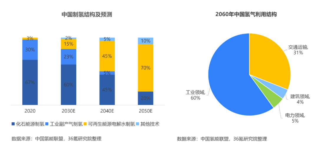 未来,各地将结合自身资源禀赋,兼顾技术发展与经济性,因地制宜选择制氢路线。工业副产气制氢可作为就近供气的补充来源,化石燃料重整配合CCUS技术作为过渡,可再生能源电解水制氢由于其纯度高、绿色环保等优势将成为大规模集中供气的主要手段。根据中国氢能联盟数据,可再生能源电解水制氢占比将由2020年3%提升至2050年的70%。应用方面,除工业应用外,以氢燃料电池汽车为主的交通领域将实现较大规模应用,预计2060年我国交通运输领域用氢将占氢能整体应用的31%。此外,在电力领域,氢储能技术可以更好实现风能、水能、太阳能等可再生能源的跨区域、跨季节调配;氢燃料电池在建筑热电联供领域的应用,能避免长距离运输约6%-8%的能量损失,具有节能环保、安静高效的优势,在中国正处于初步研发阶段,美、日已实现商业化运作。