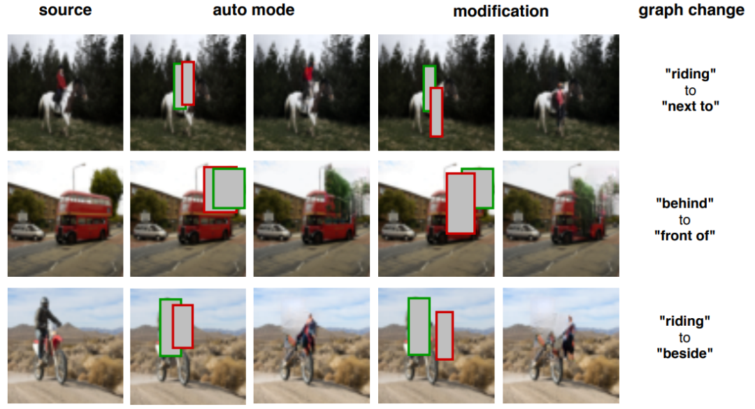 慕尼黑工业大学、牛津大学、约翰霍普金斯大学和谷歌的研究者基于场景图(scene graph)来解决图像生成新问题,其中用户仅通过应用图像生成语义图的节点或边缘改变,即可以编辑图像