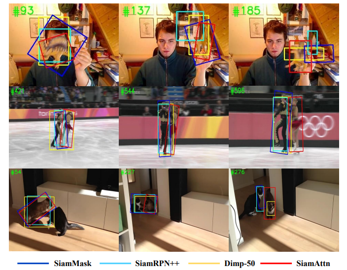 本研究中 SiamAttn 方法与其他三种当前 SOTA 跟踪器的跟踪效果比较。可以看到,SiamAttn 的结果更加准确,并且对外观变化、复杂背景和干扰物具有更强的鲁棒性。
