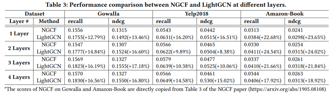NGCF 与 LightGCN 在不同数量层上的性能比较。