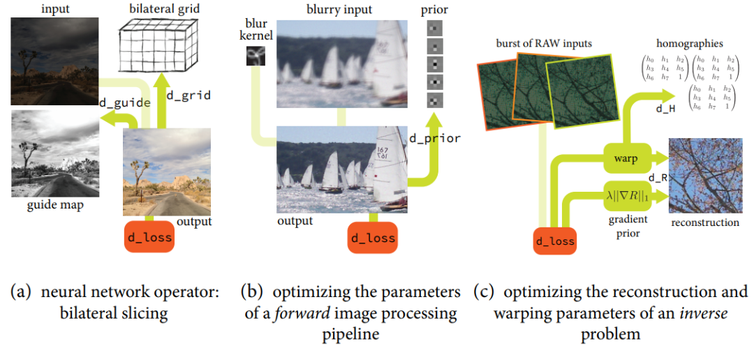 可微图像处理流程包括三部分:(a)神经网络算子:双边分切;(b):优化前向图像处理 pipeline 的参数;(c)优化逆问题的重建和扭曲参数。