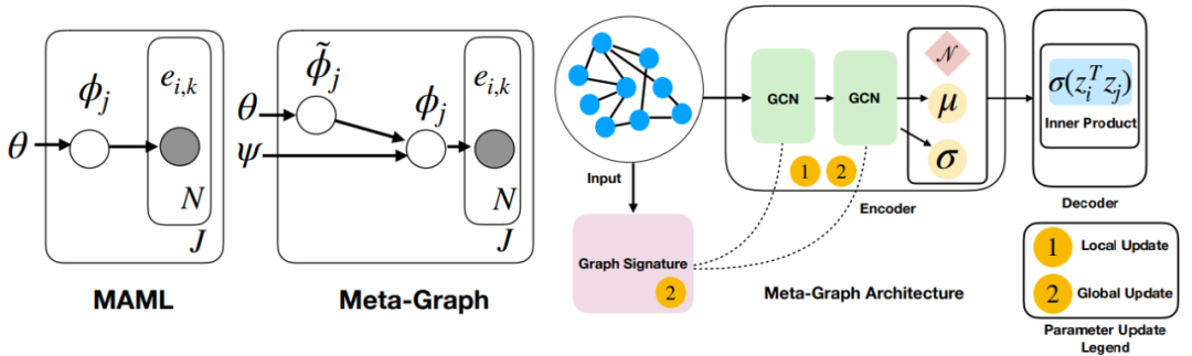 左:Meta-Graph 与 MAML(Model-Agnostic Meta-Learning) 的结构比较;右:Meta-Graph 具体架构。