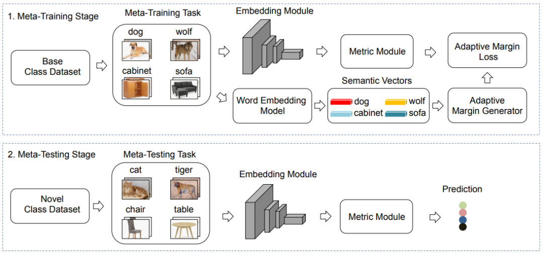 自适应边际损失方法整体架构图,它包含元训练和元测试两个阶段。
