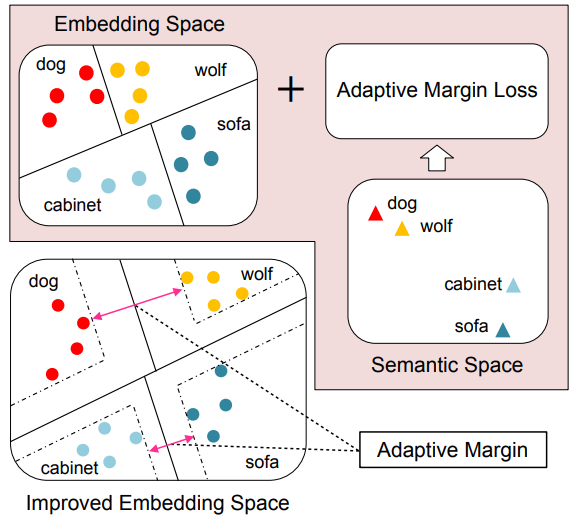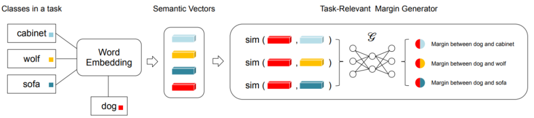 自适应边际损失方法的原理图。研究者利用不同类之间的语义相似性来生成类间自适应边际,然后将生成的边际集成至分类损失中,使得相似类在嵌入空间中的可分离性更强,由此有益于少样本学习。