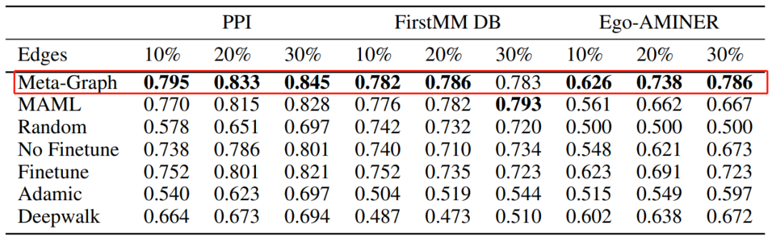 在使用一组新型链路预测基准时,研究者证实了元图可以在使用少量真实边缘(true edge)时学习快速地适应新图,在快速适应的同时也可以提升收敛结果。
