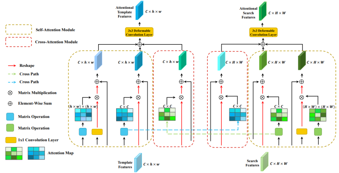 可变形孪生注意力模块包括两个子模块:self-attention 子模块和 cross-attention 子模块。