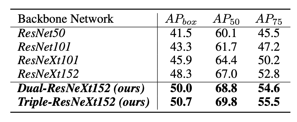 该表说明,深度更深、规模更大的主干网络可以带来更好的检测性能,而 CBNet 架构可以进一步强化现有强大目标检测主干网络的性能,如 ResNeXt152。